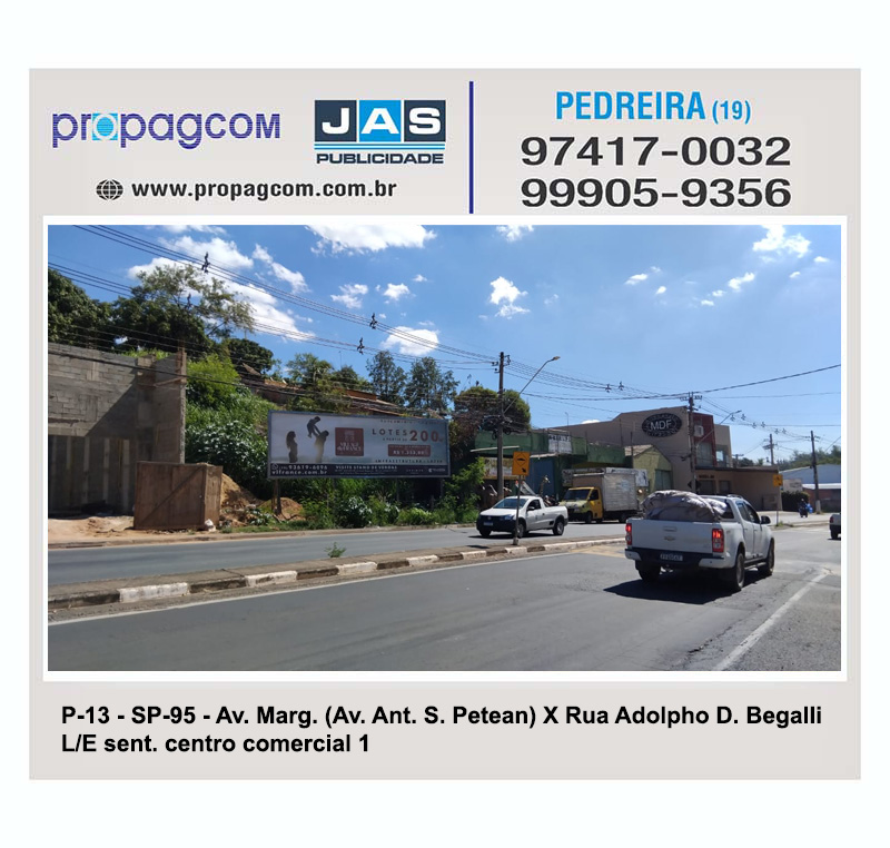 Cidade:Pedreira Código:P13 Local:P-13 - SP-95 - Av. Marg. (Av. Ant. S. Petean) X Rua Adolpho D. Begalli L/E sent. centro comercial 1 Atualizado em: 10/01/2023 - 12/01/2026 11:11:44